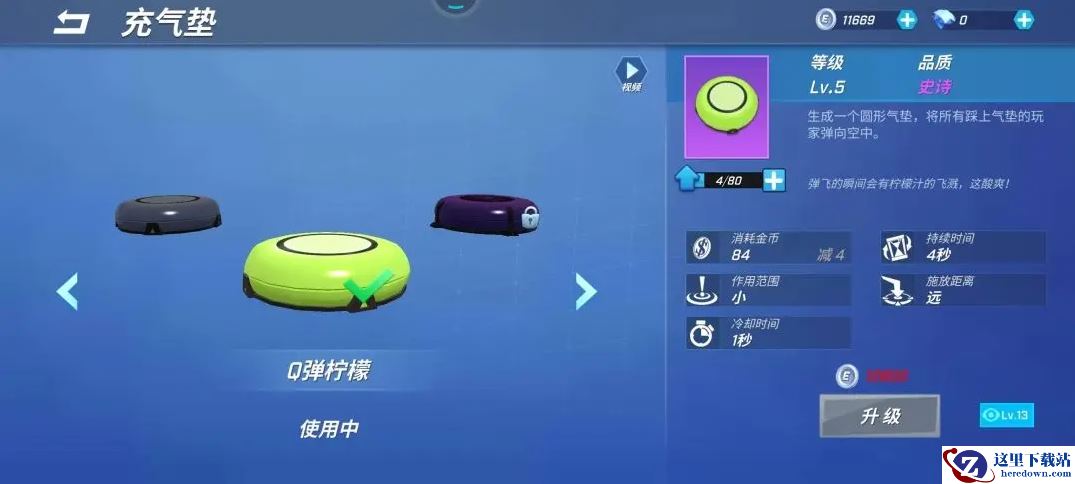 介绍:充气垫是两个阵营都可以使用的,使用时生成圆形气垫,可以将将所有踩气垫的玩家弹起又高又远。金币消耗:每次消耗金币100,但是金币消耗会随着我们道具升级而减少。升级还可以免费解锁新的皮肤