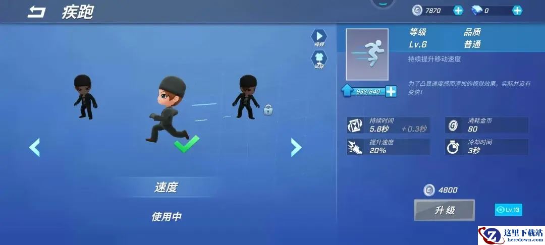 介绍:【疾跑】这个道具使用时,可以持续提升移动速度,这个道具的优势就是消耗金币是比较少的,比皮卡便宜将近一半的金币,但是速度没有皮卡快,并且疾跑只能提升自身速度,不能像皮卡一样载人,适用于紧急逃生,作为前期加速卡,还是很好用的。
