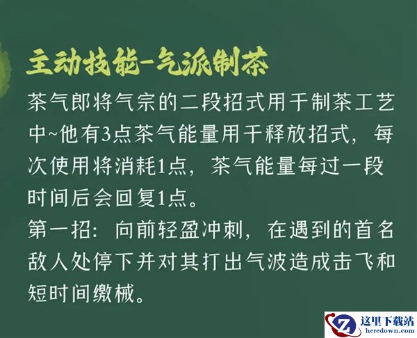 他有3点茶气能量用于释放招式,每次使用将消耗1点,茶气能量每过一段时间后会回复1点。