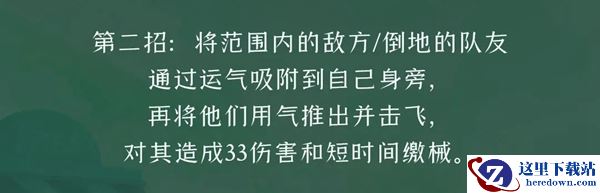 第二招:将范围内的敌方/倒地的队友通过运气吸附到自己身旁,再将他们用气推出并击飞,对其造成33伤害和短时间缴械。