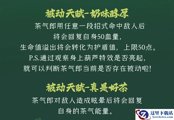 茶气郎用任意一段招式命中敌人后将会回复自身50血量,生命值溢出将会转化为护盾值,上限50点。