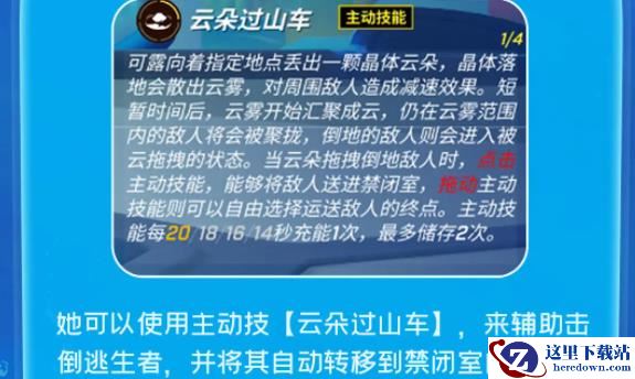 介绍:使用主动技[云朵过山车],来辅助击倒逃生者,并将其自动转移到禁闭室内淘汰。