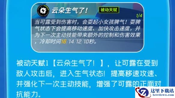 介绍:被动天赋[云朵生气了 ],让可露在受到敌人攻击后,进入生气状态,提高移速攻速并强化下一次主动技能,增强了可露的正面对抗能力。