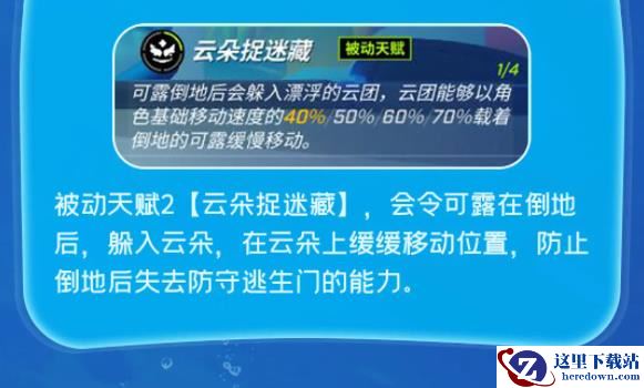 介绍:被动天赋[云朵捉迷藏],会令可露在倒地后,躲入云朵,在云朵上缓缓移动位置,防止倒地后失去防守逃生门的能力。