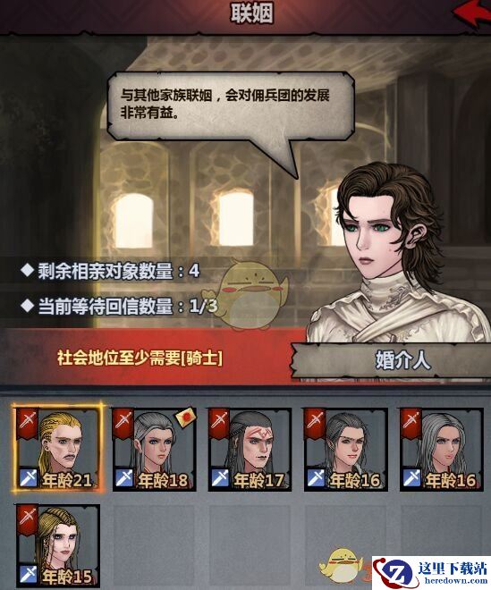 而城堡主厅的相亲也可以和所有的国家随时随地的结婚,名额是城堡主厅等级越高越多的,而且对方的属性可以用钱买,直接透明化,但问题是不保证百分百成功,也非常烧钱,最关键起码要3个月才知道能不能结婚在一起!!