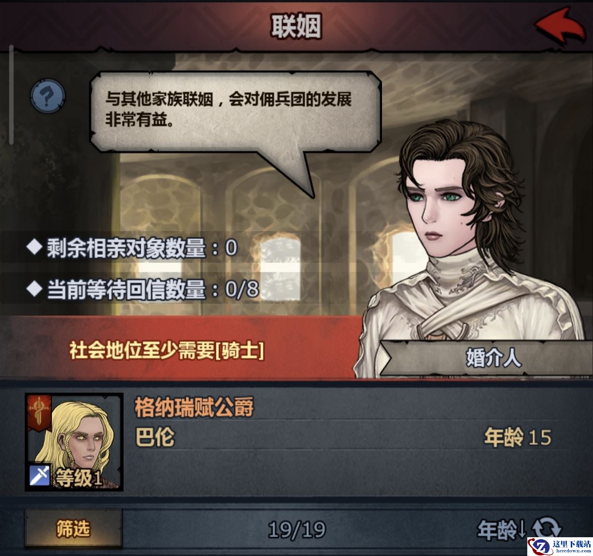 开放机制:所有拥有城堡均可使用,每年5月自动刷新联姻次数,单次联姻需消耗银币,己方角色需至少为骑士爵位,且目标国家声望达到爵位对应要求。