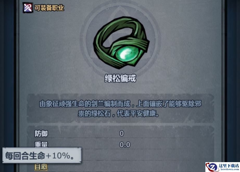 2、绿松编戒的属性是4体质、14负重、数值并不低;