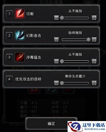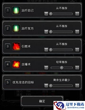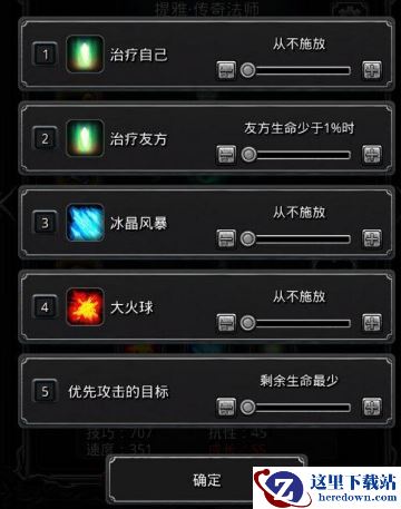 技能设置:1、传奇法师:1%奶队友,其他全关,自动挂机;2、神官骑士:纯手动,只给传奇法师加血(小怪血量28000以下,或者打Boss的最后时刻,可以转自动,增加输出);3、火法(冰法)和夜魇:纯输出,自动挂机。