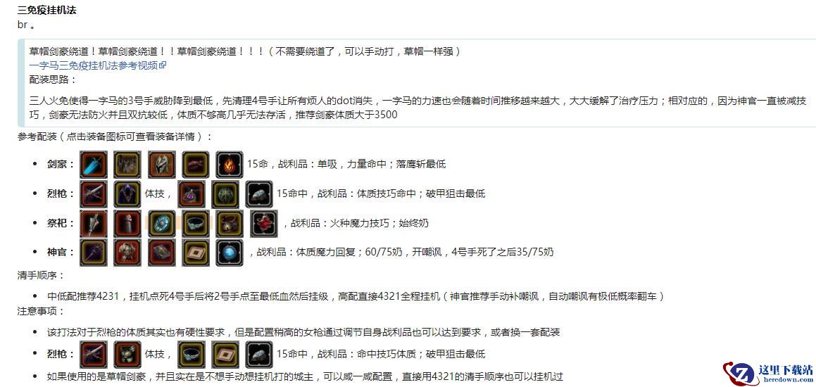剑豪手动把三号点到血量最低然后挂机,奶骑在十几秒的时候手动嘲讽一下(为了避开小狂暴),40秒左右手动嘲讽第二次,技能设置关掉嘲讽(如果剑豪发挥不错可以提前嘲讽第二次,只要保证三号火死了之后嘲讽及时断掉就好)。