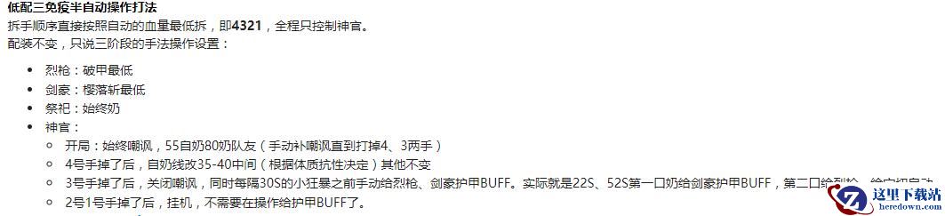 神官:开局60奶自己,80奶队友,开嘲讽。嘲讽两次后关嘲讽,也就是1分钟开始不开嘲讽了(1分钟左右需要打死三号手),等4号手dot掉了神官改成40自己80队友挂机(如果配置低神官全程可以手动操作进行补奶)