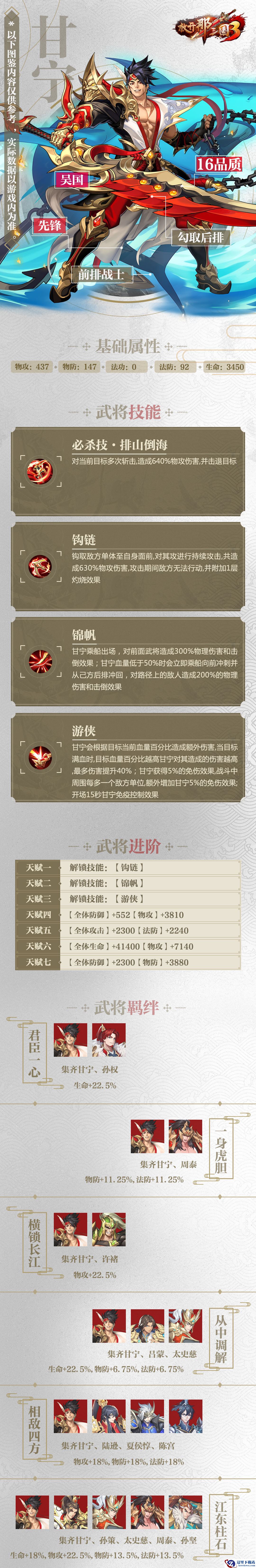 以上就是小编整理带来的《放开那三国3》甘宁属性技能羁绊图鉴介绍,更多精彩内容,请点击关注手游网,小编将持续为您更新!