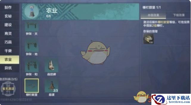 玩家可在息壤-农业中通过建造畜牧围栏、围栏数量、孵育舍和冥想舍体验养殖玩法。
