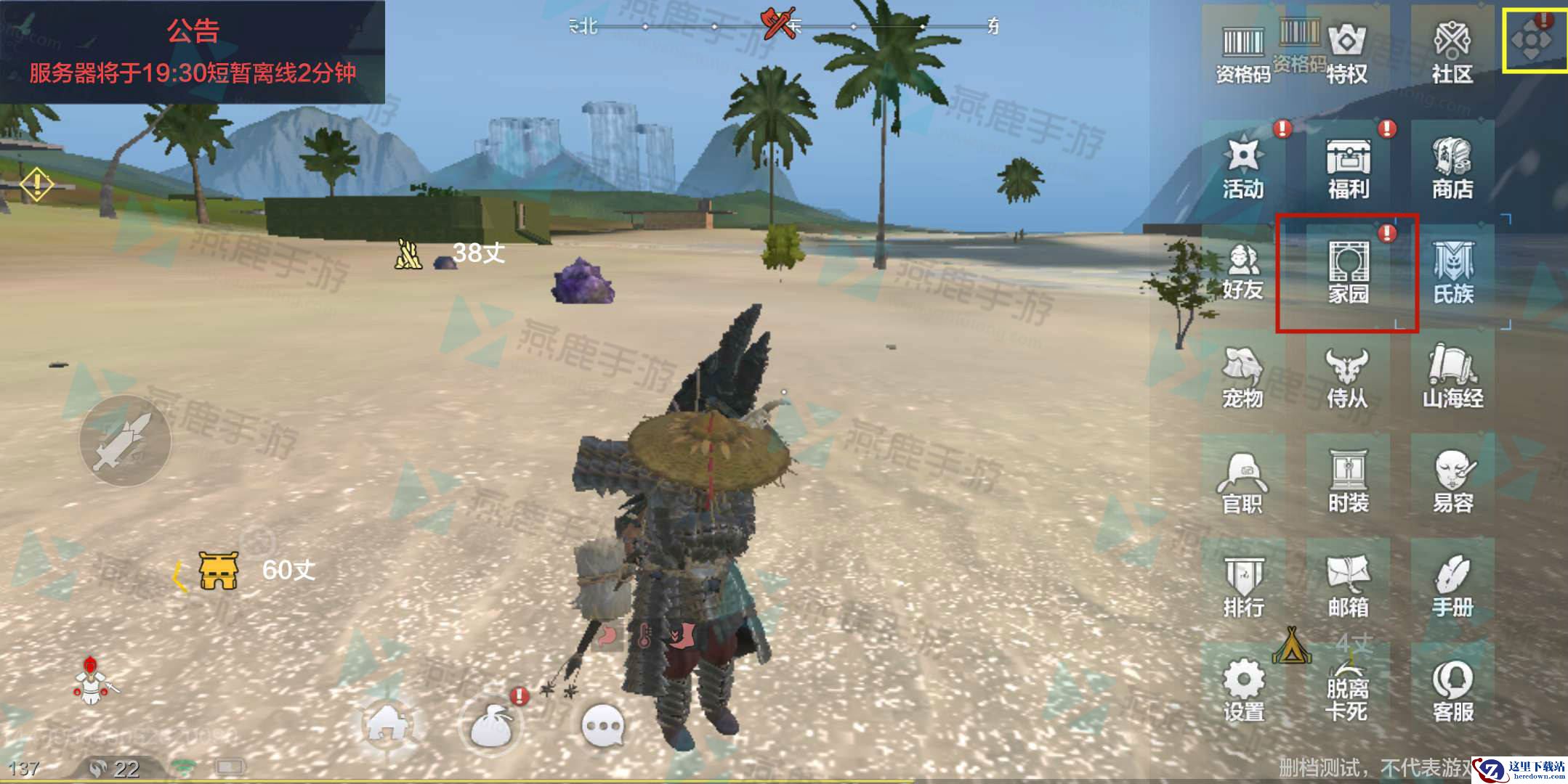 1、玩家进入游戏,点击右上角方框,在弹出的页面中点击家园,如图所示。