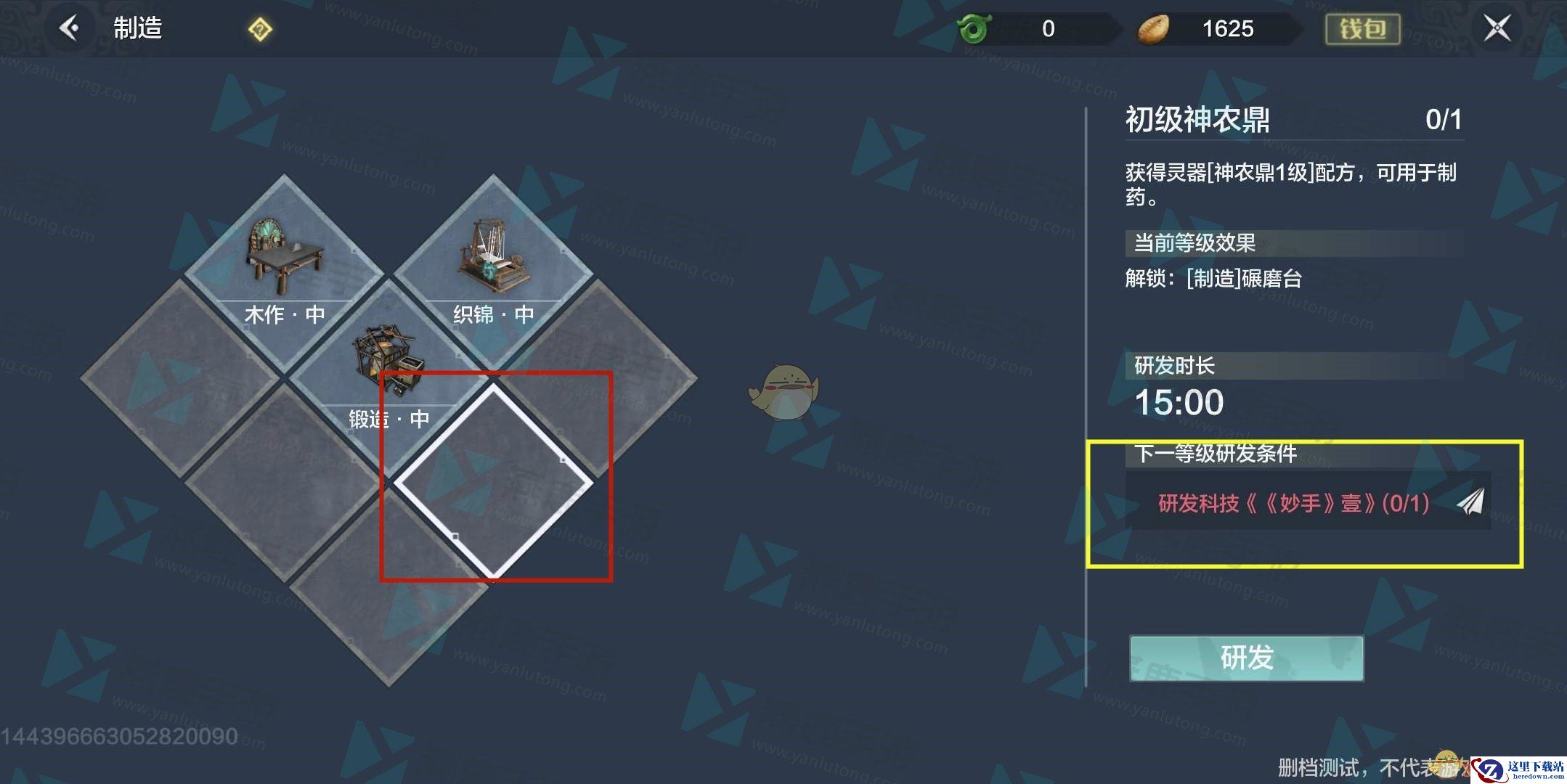 4、我们可以看到制作神龙鼎需要玩家相应的前置任务:研发科技《妙手壹》