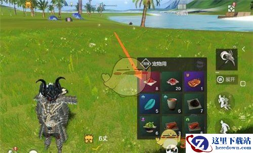 靠近你的宠物,点击下图所示的小罐头图标,就会弹出一个食物界面。将其切换为宠物使用,消耗药品就能让宠物回血了。