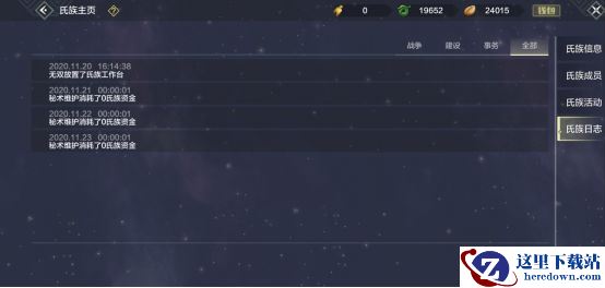 有战争,建设,事务,全部,战争属于宣战,可向敌方宣战,敌方也可向你宣战。建设属于制造,研发秘术。事务属于捐献之类的记录。全部的话就是以上所有信息的集合了。