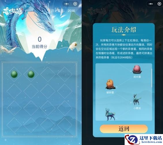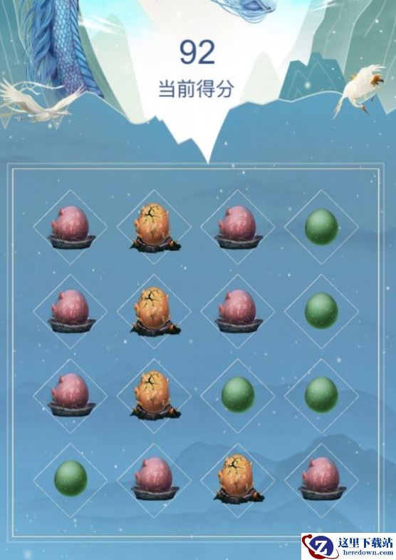 绿色的蛋即是原胎,通过上下左右滑动,当两个同样的蛋相互碰撞吞噬,就能进化出更高级的异兽蛋。注意,移动方向上的每一行,或者每一列,所有相同异兽都会两两吞噬,可以打出combo效果,获得更多得分!