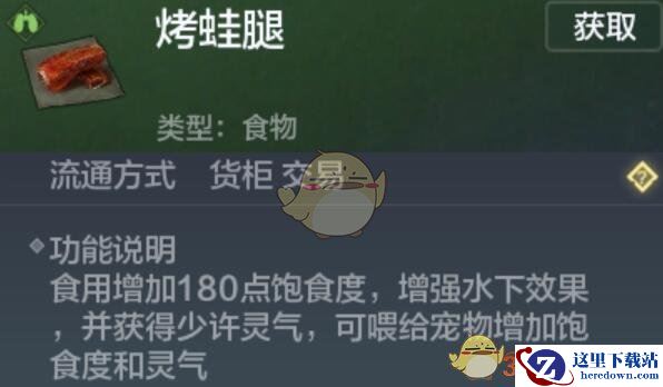 使用烤蛙腿增加180点饱食度,增强水下效果,并获得少许灵气,可喂给宠物增加饱食度和灵气。