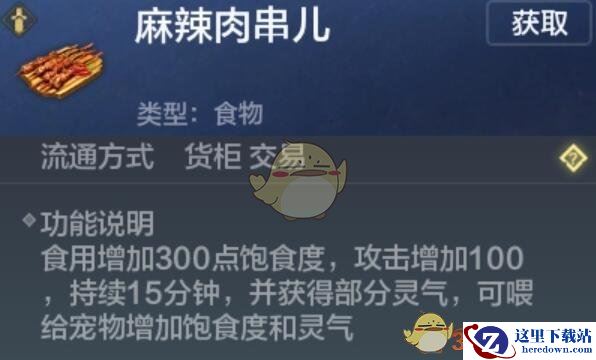 食用麻辣肉串后增加300点饱食度,攻击增加100,持续15分钟,并获得部分灵气,可喂给宠物增加饱食度和灵气。