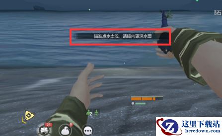 如果看到瞄准点水太浅的字样,请把你的视角往上调,看着远处的深水再将鱼竿抛出。