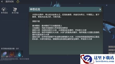 摆放好之后,有一个【入画】按钮,点击就能进入围狩图页面。在围狩图页面有四个等级不同的巨兽,分别是应龙,狌狌,萤皇和颙鸟。神兽强度随神兽开放等级提升,等级越高,奖励也越好。在页面左上角有关卡介绍,建议各位旅者进入前先看看技能介绍。