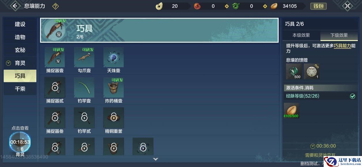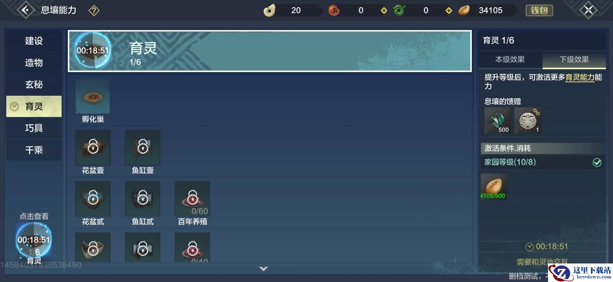 育灵主要是孵化元胎,培育花草,养殖鱼苗 的功能。除了孵化巢之外,其他可以等到游戏中期再解锁。