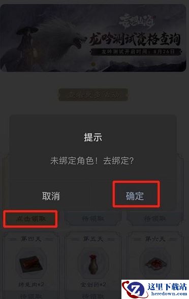 2.点击领取道具(就会提示绑定角色,点确定就好啦!)