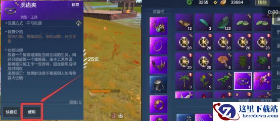 1、选一块风水宝地,点击使用。虎齿夹会自动放到旅者脚下。