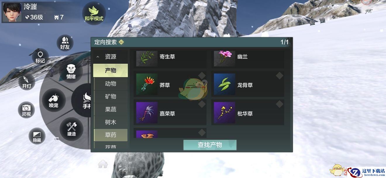 2、点击“资源——药草”,然后再输入寄生草就可以看到最近的寄生草在什么地方了!