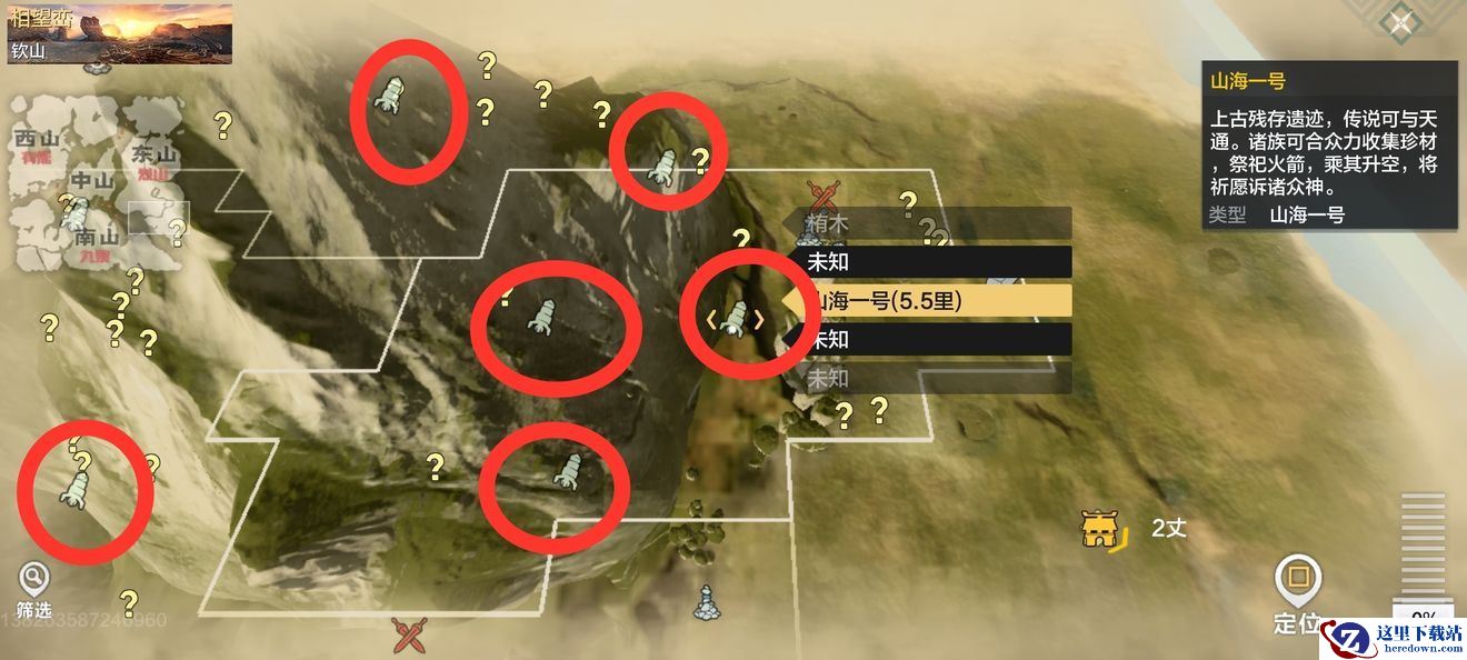 地图上火箭标识被我圈起来的全部都是山海一号标识然后我们就可以定位然后可以骑上坐骑过去