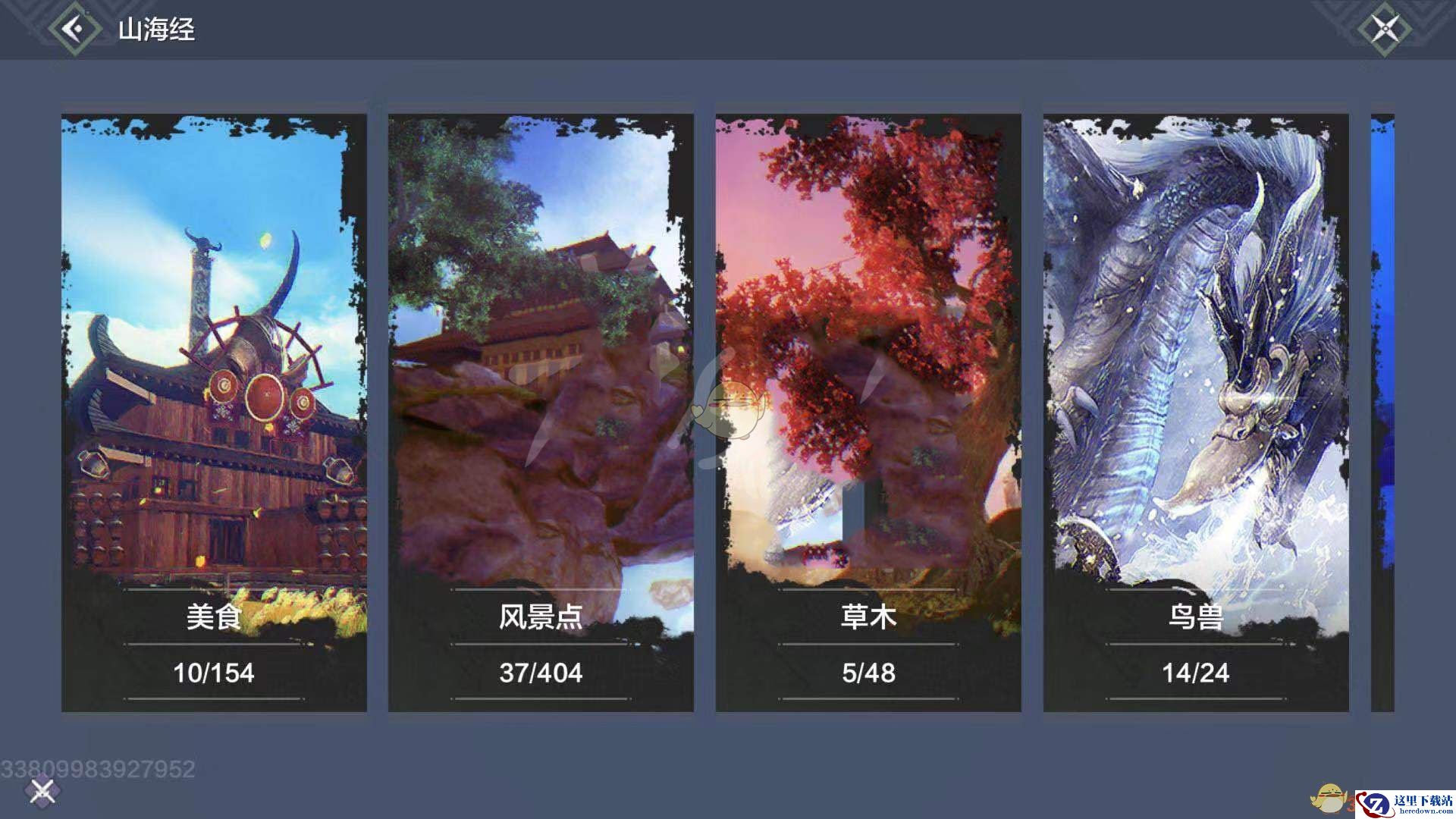 图鉴分为美食、风景点、草木、鸟、兽、钓鱼、百兽、传说、创造和群侠。
