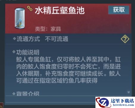 鲛人专属鱼缸,仅可将鲛人养至其中,缸内的鲛人饱食度归零时不会死亡,而是进入休眠期,补充饱食度可继续成长。