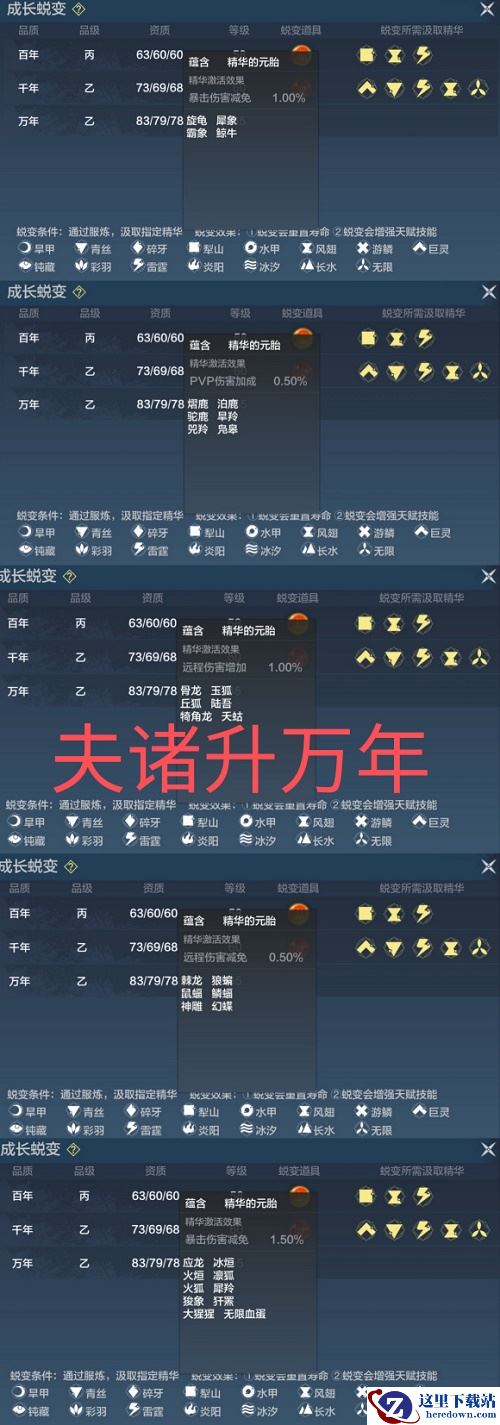 夫诸千年升万年,第一个千年印记和百年一样;第二个千年印记:旋龟、霸象、犀象、鲸牛。第一个百年印记:任意百年鹿、羚羊。第二个百年印记:鸡龙,任意蝙蝠,神雕,百年蝴蝶。