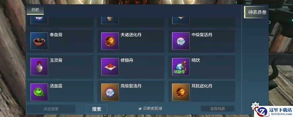 3、在药品界面中找到“精饮”并点击进入制作界面。