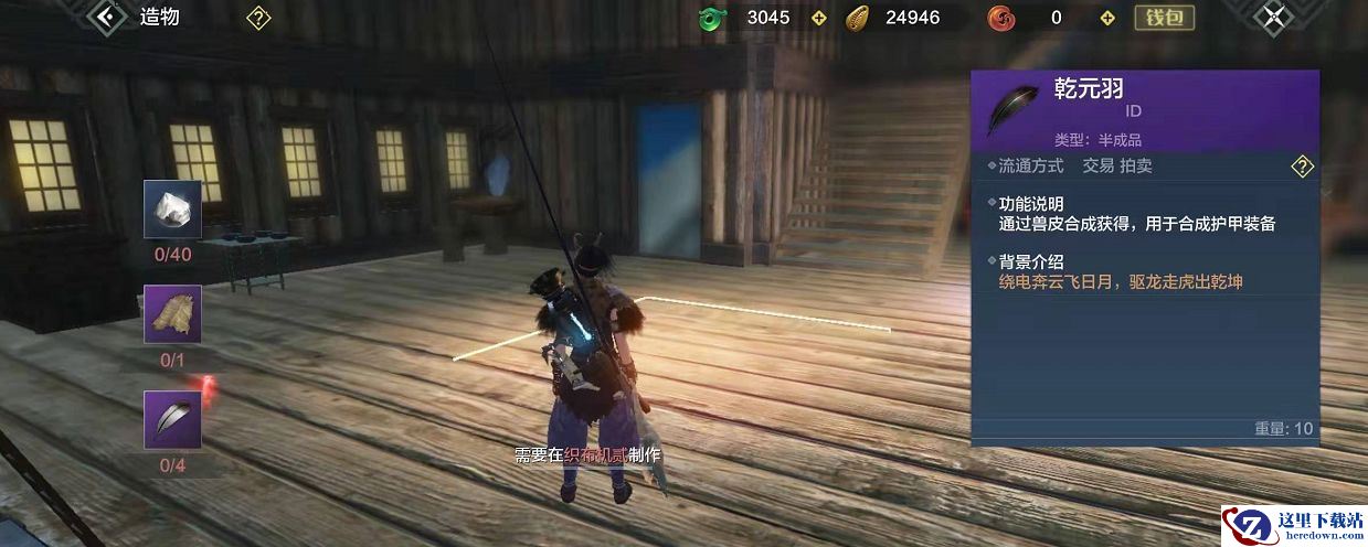 3、接着收集好制作“乾元羽”的材料。(白金*40+大荒兽皮*1+绝尘羽*4)
