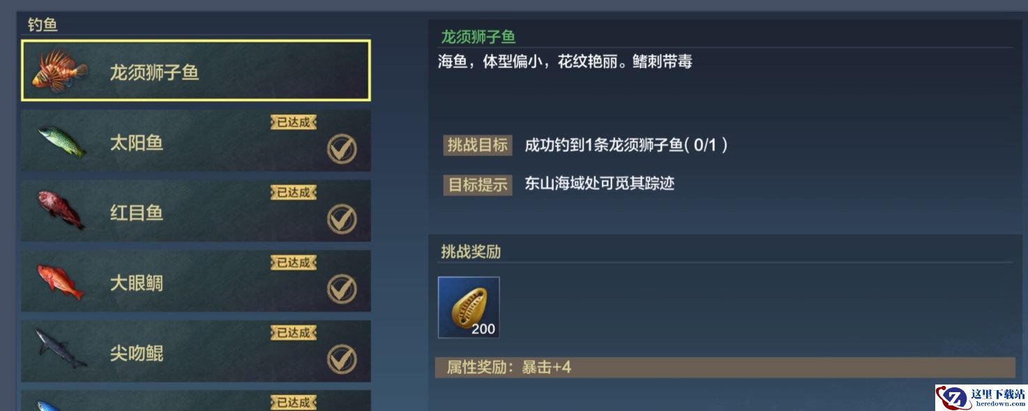 龙须狮子鱼”可以尝试去南山附近的海域垂钓,虽然游戏中里面的提示是在东山的海域,但感觉在东山很难钓到。