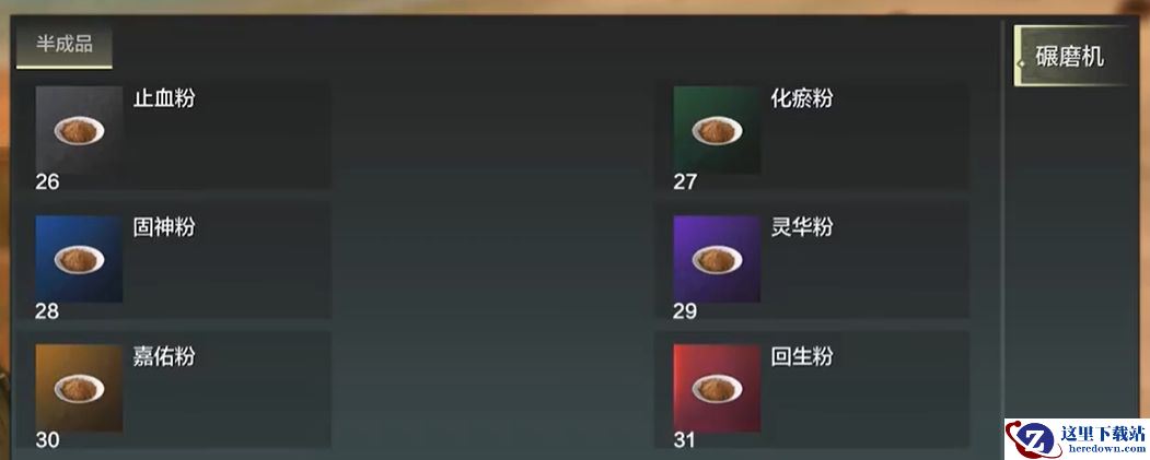 1、游戏中“碾磨机”可以用来制作各种药品的粉末,例如止血粉、化瘀粉、固神粉、灵华粉、嘉佑粉、回生粉等,其中每种药粉所需要的材料各不相同。