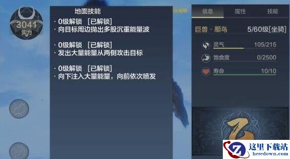 颥鸟属于千年异兽,技能基本都是地面技能,0级可以解锁三个,向目标周边抛出多股沉重能量波;发出大量能量从两侧攻击目标;向下注入大量能量,向前依次喷发。