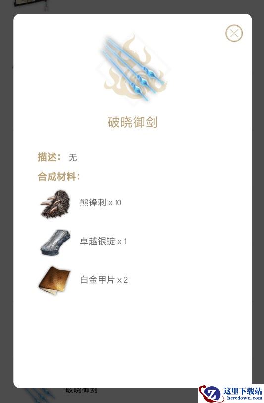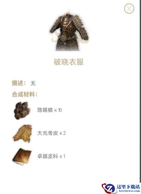 破晓衣服的制作材料有:虺蜴鳞x10,大荒兽皮x2,卓越皮料x1。