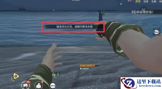 2、之后手持钓鱼竿进入垂钓状态,接着通过滑动和点击屏幕来抛出鱼竿。(如果看到瞄准点水太浅的提示,可以将视野稍微往上调一点,之后将鱼竿抛往更远的深水处)