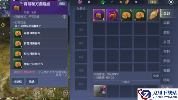 在背包内打开礼盒,月饼配方礼盒里包含莲蓉、鲜花、豆沙、甜五仁、水果这五种甜口味月饼,以及鲜肉、蟹粉、云腿、咸五仁、椒盐这五种咸口味月饼,旅者们可以自由选择要制作哪种口味的月饼。