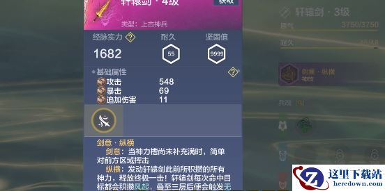2、轩辕剑属于上古神兵,神兵都拥有独立的神兵耐久,且等级越高,耐久上限越高,释放神技时会消耗耐久。