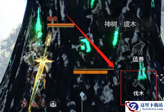 3.大世界上神树数量较多,大家无需担心。靠近神树后,将华霆斧装备到快捷武器栏,点击伐木,即可砍伐神树,注意神树比较坚固,需要多砍伐几次。成功砍伐后,神树消失,任务完成。