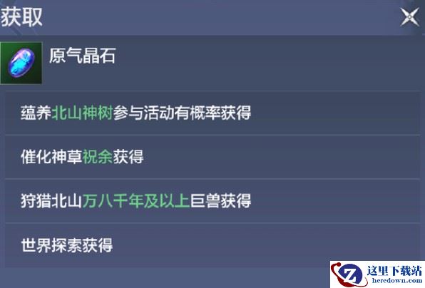 【初入北山 - 神兵等级】根据引导框点击主界面左上角位置打开个人信息,点击神兵来到上古神兵界面,随后点击灌注,当灌注材料-原气晶石不足时,将会提示以下获得途径: