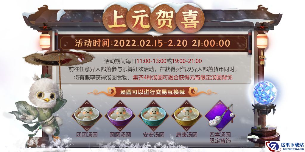 1、活动期间每日11:00-13:00或19:00-21:00前往任意异人部落参与乐舞狂欢活动,除了可获得大量灵气和异人部落货币之外,将有概率获得不同的汤圆食物道具。
