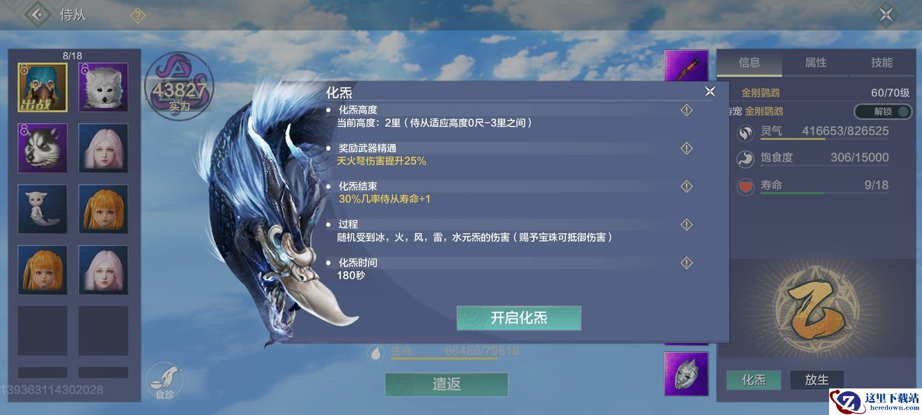 4.点开侍从界面,开启化炁,此时界面会显示侍从所处高度、预计奖励武器精通、寿命恢复几率、化炁持续时间。