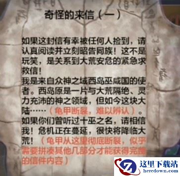 我是来自众神之域西岛巫咸国的使者。西岛原是一片与大荒隔绝、灵力充沛的神之领域,但如今这块大陆……(龟甲断裂,难以辨认)。如果你们曾听过十巫之名,请相信我!危机正在蔓延,很快将降临大荒!(龟甲从这里彻底断裂,似乎需要拼凑其他几部分才能获得完整的信件内容)