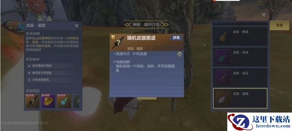 6.凛冽的灵泉:兵祸图残片,迷谷心,凤鸣-开天随机武器图纸,随机紫色橙色红色兵魂,北山万狩图图样,神兵石。