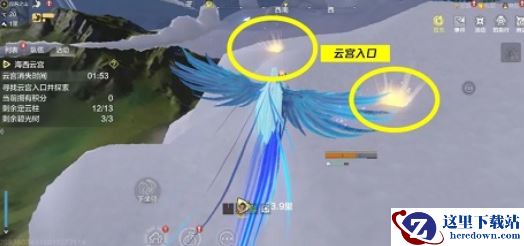 3、云宫入口非常明显,往海西云宫所在云朵一站,发光处就是入口了,钻进云洞顺着通道而行即可抵达云宫内部。