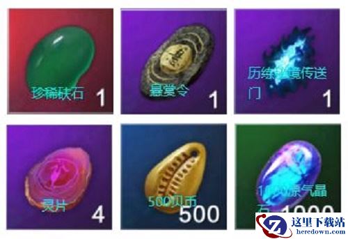 一、固定奖励:珍贵砆石、悬赏令、历练秘境传送门、灵片、贝币、原气晶石。